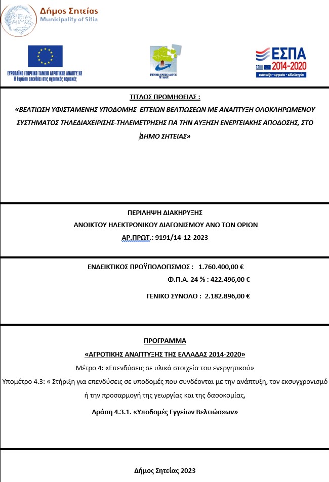ΔΙΑΚΗΡΥΞΗ – «ΒΕΛΤΙΩΣΗ ΥΦΙΣΤΑΜΕΝΗΣ ΥΠΟΔΟΜΗΣ ΕΓΓEIΩΝ ΒΕΛΤΙΩΣΕΩΝ ΜΕ ΑΝΑΠΤΥΞΗ ΟΛΟΚΛΗΡΩΜΕΝΟΥ ΣΥΣΤΗΜΑΤΟΣ ΤΗΛΕΔΙΑΧΕΙΡΙΣΗΣ-ΤΗΛΕΜΕΤΡΗΣΗΣ ΓΙΑ ΤΗΝ ΑΥΞΗΣΗ ΕΝΕΡΓΕΙΑΚΗΣ ΑΠΟΔΟΣΗΣ, ΣΤΟ ΔΗΜΟ ΣΗΤΕΙΑΣ»