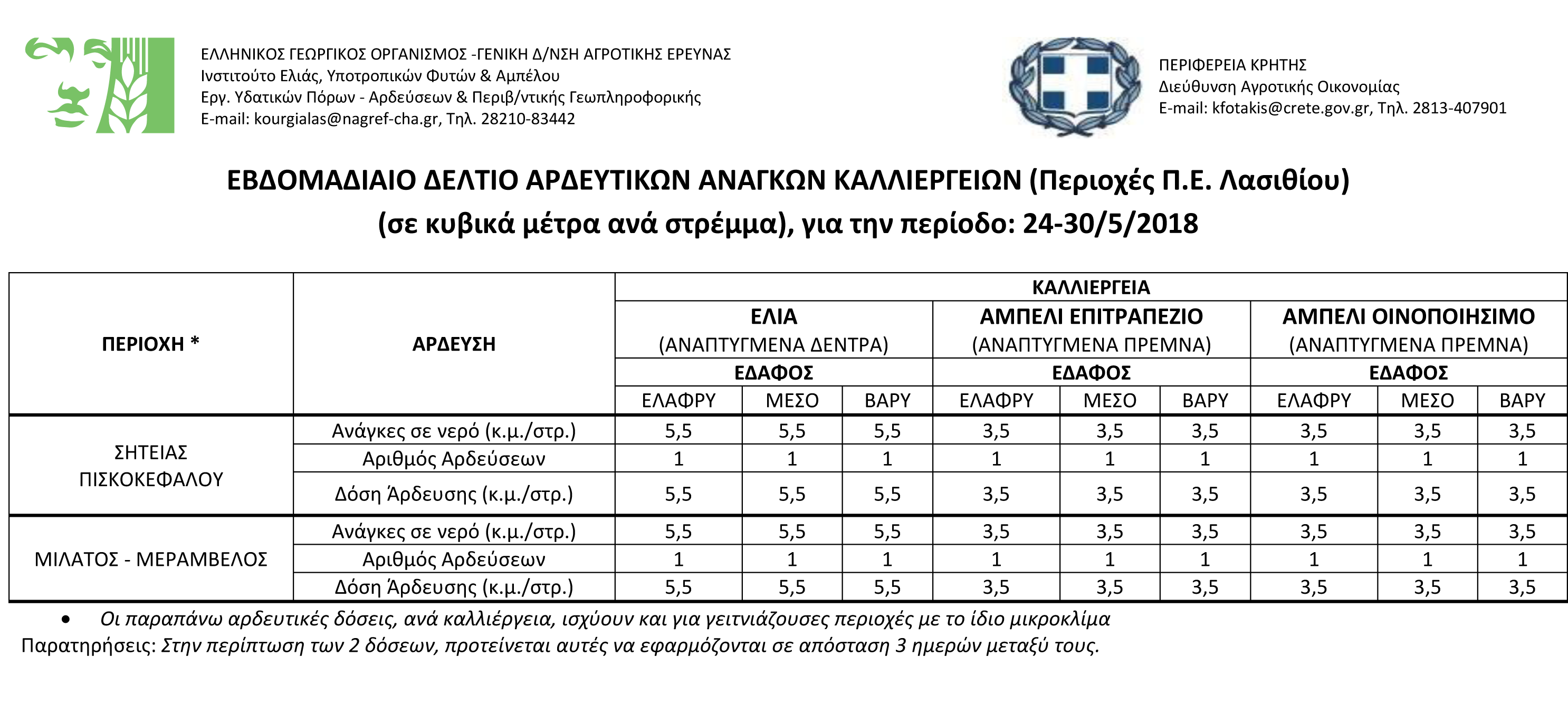 Στα πλαίσια της συνεργασίας του Δήμου Σητείας με τον «ΕΛΛΗΝΙΚΟ ΓΕΩΡΓΙΚΟ ΟΡΓΑΝΙΣΜΟ -ΓΕΝΙΚΗ Δ/ΝΣΗ ΑΓΡΟΤΙΚΗΣ ΕΡΕΥΝΑΣ Ινστιτούτο Ελιάς, Υποτροπικών Φυτών & Αμπέλου Εργ. Υδατικών Πόρων – Αρδεύσεων & Περιβ/ντικής Γεωπληροφορικής» ανακοινώνουμε το ΕΒΔΟΜΑΔΙΑΙΟ ΔΕΛΤΙΟ ΑΡΔΕΥΤΙΚΩΝ ΑΝΑΓΚΩΝ ΚΑΛΛΙΕΡΓΕΙΩΝ (Περιοχές Π.Ε. Λασιθίου) για την περίοδο από 24 – 30/5/2018 που στάλθηκε στο τμήμα Άρδευσης του Δήμου Σητείας και αφορά πιλοτικά την περιοχή Πισκοκεφάλου.
