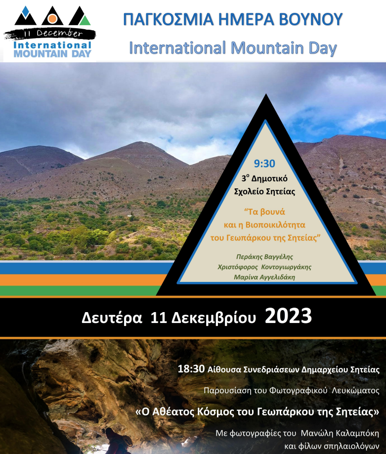 Στο πλαίσιο των εκδηλώσεων για την Παγκόσμια Ημέρα Βουνού, το Παγκόσμιο Γεωπάρκο της Σητείας και ο ΔΟΚΑΣ σας προσκαλούν την Δευτέρα  11 Δεκεμβρίου  2023, στις 18:30 στην Αίθουσα Συνεδριάσεων Δημαρχείου Σητείας στην Παρουσίαση του Φωτογραφικού  Λευκώματος «Ο Αθέατος Κόσμος του Γεωπάρκου  Σητείας», με φωτογραφίες του  Μανώλη Καλαμπόκη και φίλων σπηλαιολόγων, από τα σπουδαία σπήλαια που διαθέτει η Σητεία.