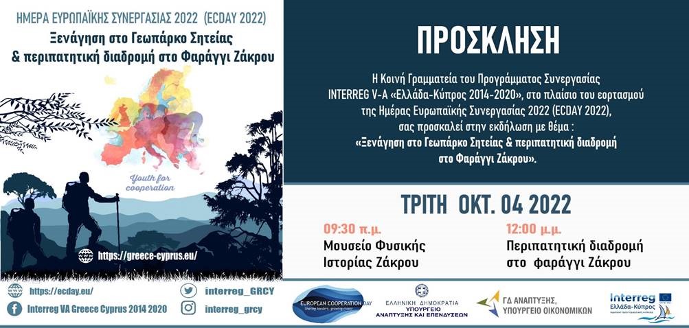 Η Κοινή Γραμματεία του Προγράμματος Συνεργασίας INTERREG V-A «Ελλάδα Κύπρος 2014-2020», υπό την αιγίδα της Ειδικής Γραμματείας Διαχείρισης Τομεακών Ε.Π. του ΕΤΠΑ & ΤΑ, της Γενικής Διεύθυνσης Ανάπτυξης του Υπουργείου Οικονομικών, της Κυπριακής Δημοκρατίας και της Ειδικής Υπηρεσίας Διαχείρισης , στο πλαίσιο του εορτασμού της Ημέρας Ευρωπαϊκής Συνεργασίας 2022 (ECDAY 2022), διοργανώνει εκδήλωση την Τρίτη 4 Οκτωβρίου 2022 από τις 09:30 μέχρι τις 14:00 με τίτλο: