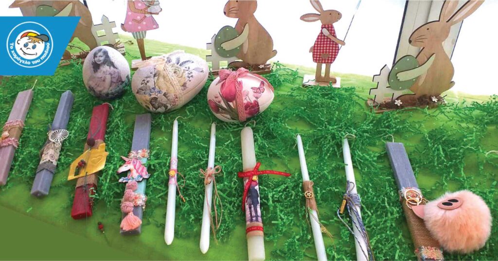 Στα πασχαλινά bazaars θα βρείτε χειροποίητες πασχαλινές λαμπάδες και πασχαλινές κατασκευές, δώρα για μικρούς και μεγάλους που δημιούργησαν οι εργαζόμενοι και οι εθελοντές των Εθελοντικών Δημιουργικών Εργαστηρίων του οργανισμού για την κάλυψη των αναγκών των παιδιών που μεγαλώνουν στα Σπίτια του.
