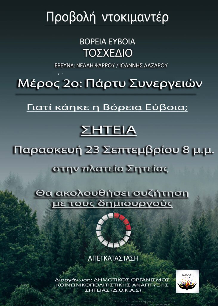 Σας προσκαλούμε στην προβολή ντοκιμαντέρ Βόρεια Εύβοια, Το Σχέδιο, μέρος 2ο: “Πάρτυ Συνεργειών”, που θα προβληθεί στην πλατεία της Σητείας την Παρασκευή 23 Σεπτεμβρίου, στις 8μμ.