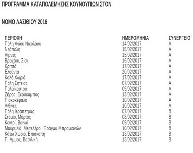 Από το Τμήμα Περιβαλλοντικής Υγιεινής & Υγειονομικού Ελέγχου της Δ/νσης Δημόσιας Υγείας & Κοινωνικής Μέριμνας της Περιφερειακής Ενότητας Λασιθίου, ανακοινώθηκε ότι την Τρίτη 07/02/2017 θα ξεκινήσει η 8η εφαρμογή του προγράμματος καταπολέμησης κουνουπιών για το έτος 2016.