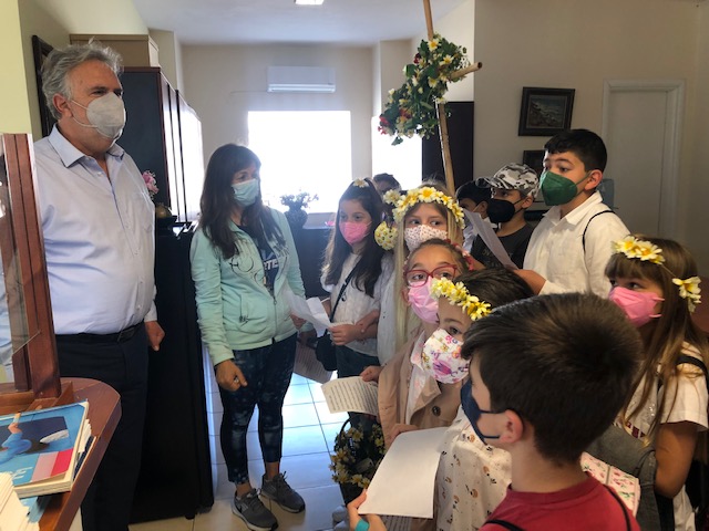 Τα παιδιά ευχήθηκαν στον Δήμαρχο για τις εορτές του Πάσχα, προσέφεραν λουλούδια και γλυκά και τραγούδησαν τα παραδοσιακά κάλαντα του Λαζάρου.