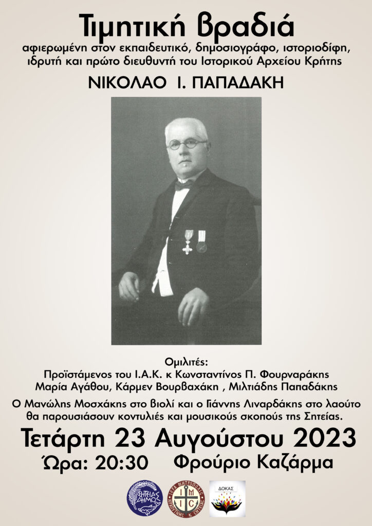 Η Ιερά Μητρόπολη Ιεραπύτνης και Σητείας σε συνεργασία με τον Δήμο Σητείας, με αίσθημα ευθύνης για τη γνώση της τοπικής μας ιστορίας, συνδιοργανώνουν την Τετάρτη 23 Αυγούστου 2023 και ώρα 20:30 μ.μ. στην Καζάρμα τιμητική βραδιά με ελεύθερη είσοδο, αφιερωμένη στον μακαριστό, καταγόμενο από το Καρύδι, εκπαιδευτικό, δημοσιογράφο, ιστοριοδίφη, ιδρυτή και πρώτο διευθυντή του Ιστορικού Αρχείου Κρήτης ΝΙΚΟΛΑΟ Ι. ΠΑΠΑΔΑΚΗ.