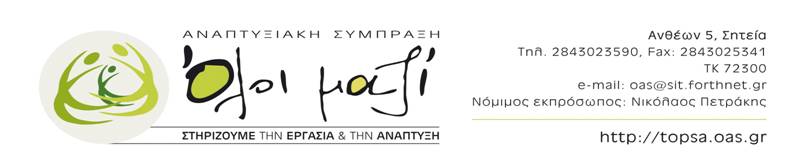 Παρουσιάστηκε την Τρίτη από τον Δήμαρχο Σητείας κ. Θοδωρή Πατεράκη, τον Πρόεδρο της Αναπτυξιακής Σύμπραξης «Όλοι Μαζί» κ. Νικόλαο Πετράκη και τον Διαχειριστή κ. Μανώλη Τσαντάκη, η Πράξη «ΣΤΗΡΙΖΟΥΜΕ ΤΗΝ ΕΡΓΑΣΙΑ ΚΑΙ ΤΗΝ ΑΝΑΠΤΥΞΗ». Την Πράξη υλοποιεί η Αναπτυξιακή Σύμπραξη «Όλοι Μαζί», στο πλαίσιο της Δράσης 7: «Τοπικά Σχέδια για την Απασχόληση προσαρμοσμένα στις ανάγκες των Τοπικών Αγορών Εργασίας», της Κατηγορίας Παρέμβασης 1: «Ενεργητικές πολιτικές απασχόλησης», του Θεματικού Άξονα Προτεραιότητας 3: «Διευκόλυνση της πρόσβασης στην απασχόληση», του Επιχειρησιακού Προγράμματος «Ανάπτυξη Ανθρώπινου Δυναμικού» του ΕΣΠΑ 2007-2013.