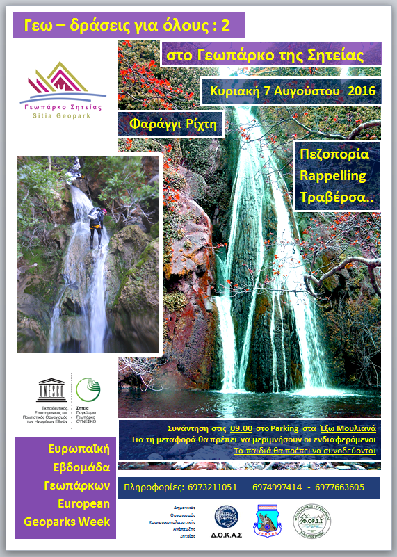 Ο Δημοτικός Οργανισμός Κοινωνικοπολιτιστικής Ανάπτυξης Σητείας, η Επιτροπή Διαχείρισης Γεωπάρκου Σητείας, ο Ορειβατικός Φυσιολατρικός Σύλλογος Σητείας και η ΕΔΕΑΚ, συνδιοργανώνουν για δεύτερη χρονιά τις «Γεω – δράσεις του Γεωπάρκου της Σητείας» και σας καλούν να συμμετέχετε την Κυριακή 7 Αυγούστου στο Φαράγγι Ρίχτη στα Έξω Μουλιανά.