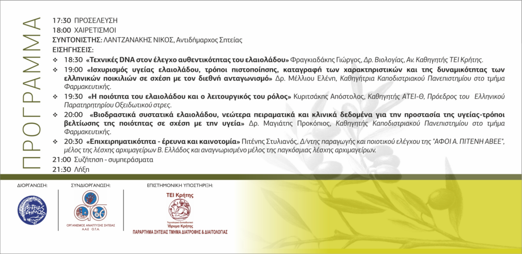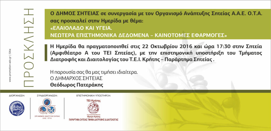 13.10.2016.Ημερίδα με θέμα: “Ελαιόλαδο & Υγεία. Νεώτερα Επιστημονικά Δεδομένα – Καινοτόμες Εφαρμογές”.