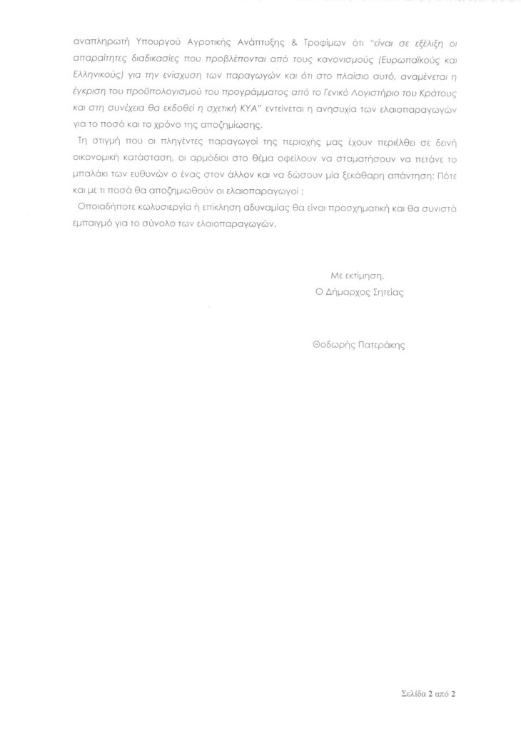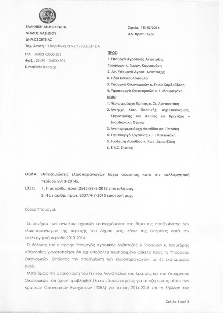 15.10.2014.Επιστολή Δημάρχου για τις αποζημιώσεις ελαιοπαραγωγών λόγω ακαρπίας κατά την καλλιεργητική περίοδο 2013-2014.