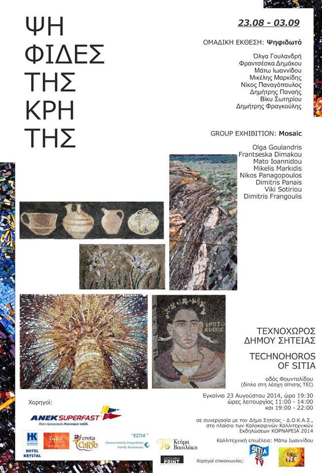 Η Έκθεση Ψηφιδωτού με έργα εμπνευσμένα  από την Κρήτη θα εγκαινιαστεί το Σάββατο 23 Αυγούστου στις 7.30 μ.μ. στον Τεχνοχώρο Δήμου Σητείας (οδός Φουνταλίδου, δίπλα στη Λέσχη Σίτισης ΤΕΙ), σε συνεργασία με το Δήμο Σητείας–Δ.Ο.Κ.Α.Σ., στο πλαίσιο των καλοκαιρινών καλλιτεχνικών εκδηλώσεων «Κορνάρεια 2014», και θα διαρκέσει μέχρι και τις 3 Σεπτεμβρίου 2014 (Ώρες λειτουργίας: 11:00 – 14:00 και 19:00 – 22:00).