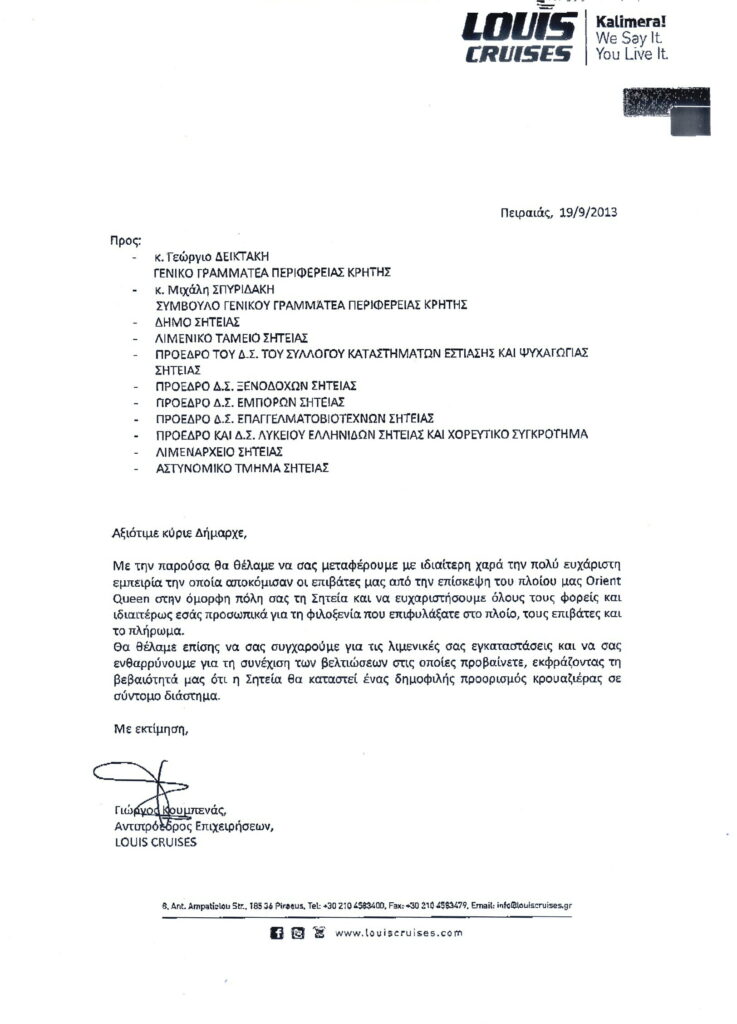 23.9.2013.Ευχαριστήρια επιστολή στον Δήμαρχο Σητείας για τη φιλοξενία και την υποδοχή του κρουαζιερόπλοιου Orient Queen
