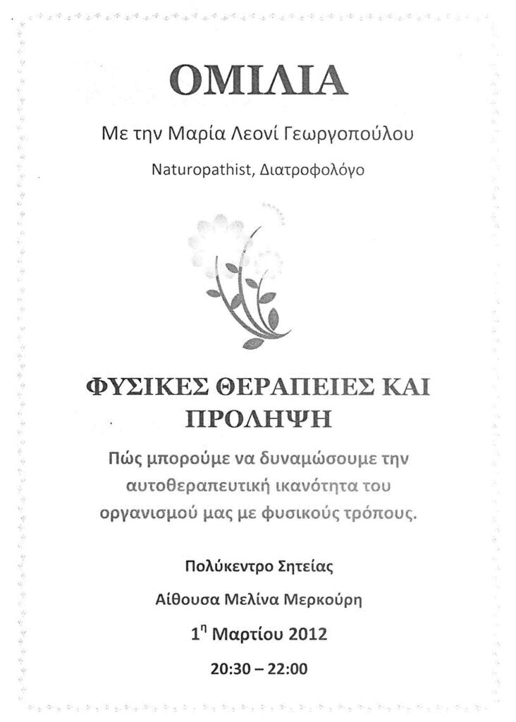 24-02-2012.ΔΕΛΤΙΟ ΤΥΠΟΥ-ΠΡΟΣΚΛΗΣΗ ΣΕ ΟΜΙΛΙΑ ΜΕ ΘΕΜΑ «ΦΥΣΙΚΕΣ ΘΕΡΑΠΕΙΕΣ &ΠΡΟΛΗΨΗ» ΤΗΝ ΠΕΜΠΤΗ 1η ΜΑΡΤΙΟΥ ΣΤΟ ΠΟΛΥΚΕΝΤΡΟ
