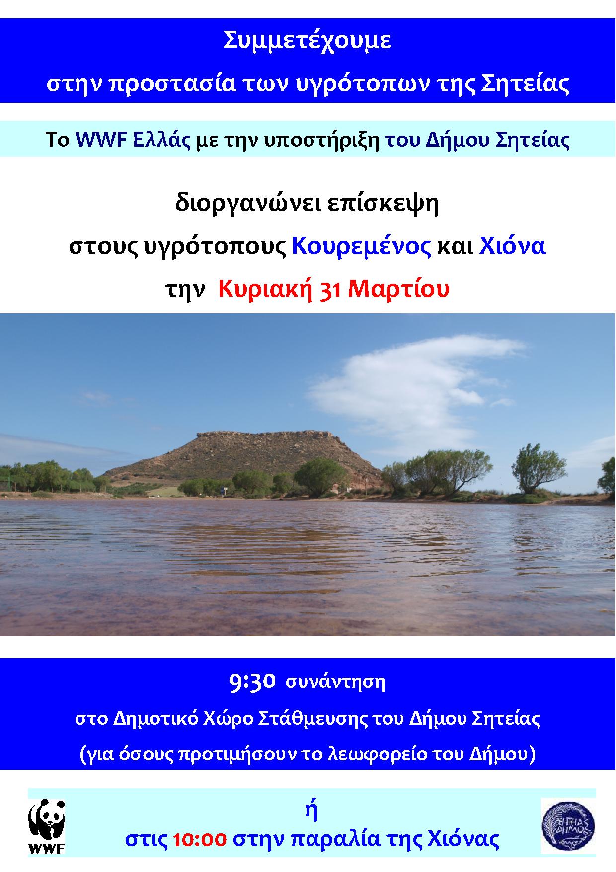 Το WWF Ελλάς , στο πλαίσιο του εθελοντικού προγράμματος «Δίκτυο για την Παρακολούθηση της Κατάστασης των Υγροτόπων της Κρήτης» και με την υποστήριξη του Δήμου Σητείας διοργανώνει επίσκεψη στους υγροτόπους Κουρεμένο και Χιόνα.