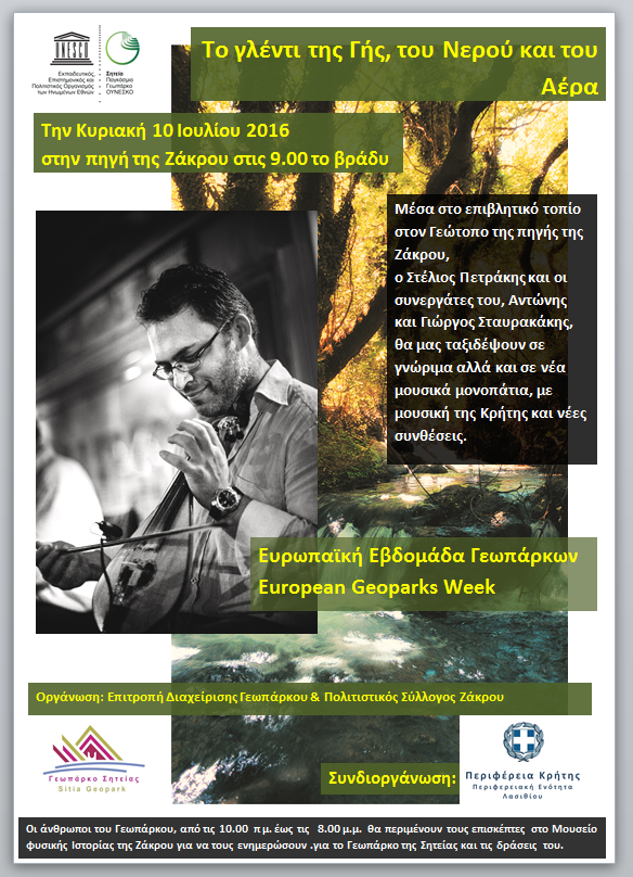 Στα πλαίσια των εκδηλώσεων για την Ευρωπαϊκή Εβδομάδα Γεωπάρκων, ο Δημοτικός Οργανισμός Κοινωνικοπολιτιστικής Ανάπτυξης Σητείας (ΔΟΚΑΣ) και η Επιτροπή Διαχείρισης Γεωπάρκου Σητείας, σε συνεργασία με τον Πολιτιστικό Σύλλογο Ζάκρου και συνδιοργανωτή την Περιφέρεια Κρήτης, Περιφερειακή Ενότητα Λασιθίου, σας προσκαλούν στην Κυριακή 10 Ιουλίου στην πηγή της Ζάκρου σε ένα γλέντι της Γής, του Νερού και του Αέρα, με τον Στέλιο Πετράκη.